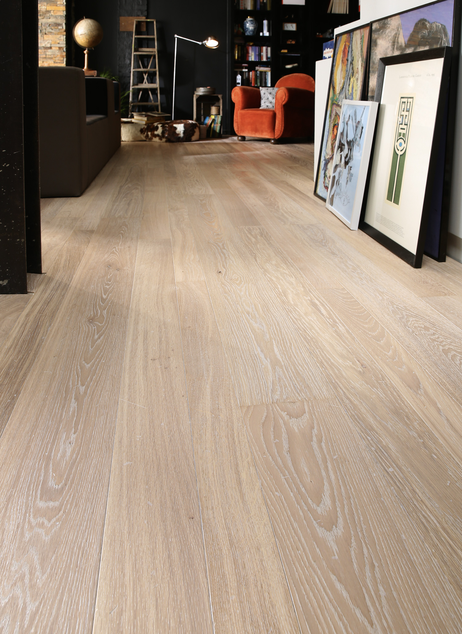 Parquet dont les lames, de largeurs inégales, sont disposées parallèlement.